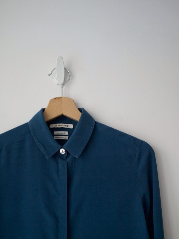Bluzka ekskluzywnej niemieckiej marki Rich&Royal, specjalizującej się w zrównoważonej produkcji ubrań. Wykonana z jedwabiu, zapinana na guziki z naturalnej muszli. Kolor ciemny turkusowy.