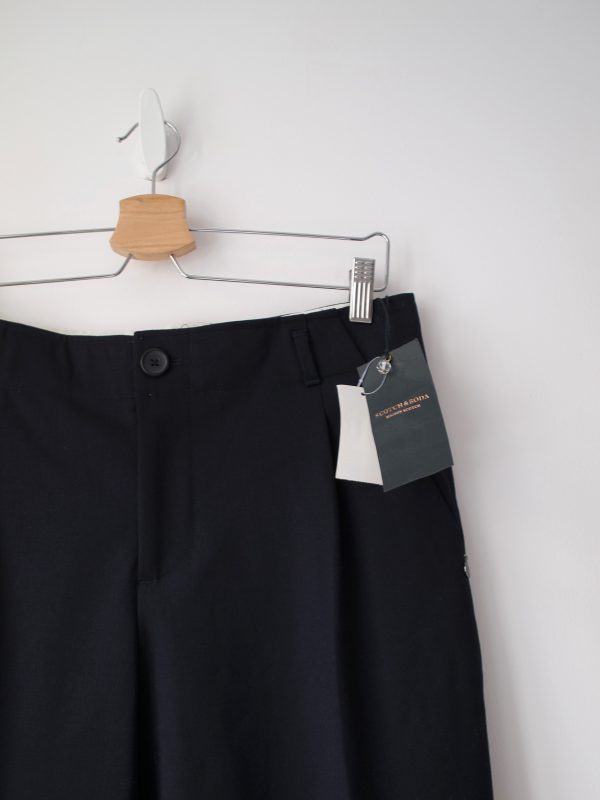 Spodnie niderlandzkiej marki Scotch & Soda. Wykonane z tkaniny z dużym udziałem wełny. Model cropped. Cena z metki 159, 95 £, czyli ponad 800 zł. Kolor to bardzo ciemny, prawie czarny granat.