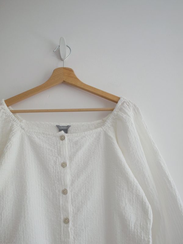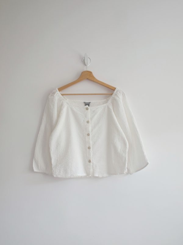 Biała bluzka z bawełny gofrowanej, zapinana na guziki, z kwadratowym dekoltem i elastycznymi wstawkami przy ramionach i rękawach.