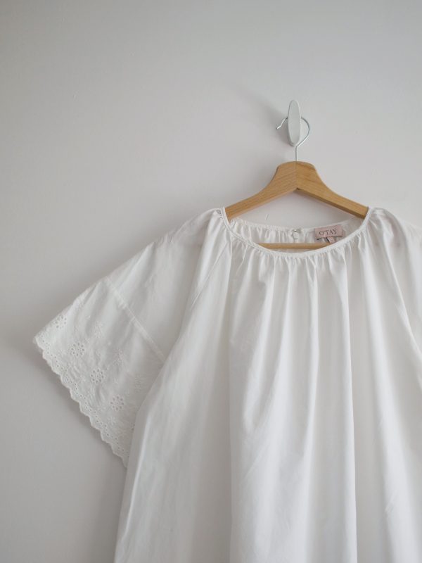 Sukienka w rustykalnym stylu duńskiej marki O’tay, specjalizującej się w produkcji wysokiej jakości ubrań. Cena nowej sukienki tej marki to około 200 euro. Model o luźnym fasonie, z rękawami i dołem wykończonymi haftem angielskim. Zapinana z tyłu na zamek.