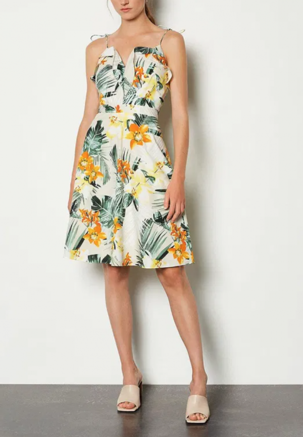 Bawełniana sukienka w tropikalny wzór od ekskluzywnej marki Karen Millen. Model z podszewką, zapewniający komfort nawet w upalne dni. Cena katalogowa: 223 euro.