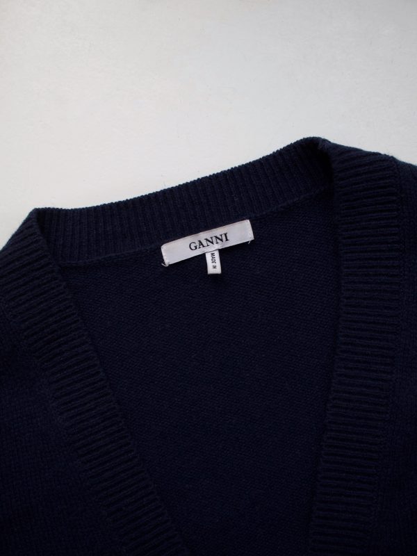 Kardigan renomowanej skandynawskiej marki Ganni. Wykonany z miłej w dotyku wełny merino z dodatkiem wełny z jaka oraz poliamidu, nie gryzie. Kolor granatowy.