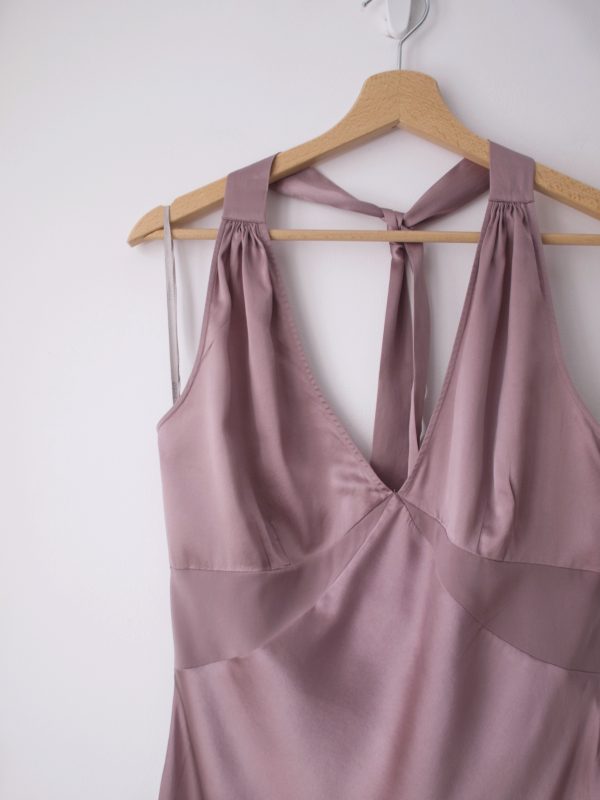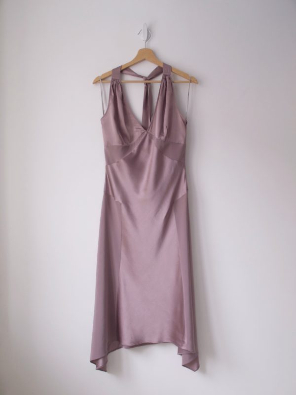 Jedwabna sukienka z odkrytymi plecami. Zapinana na boczny zamek, bez podszewki ( nie prześwituje)