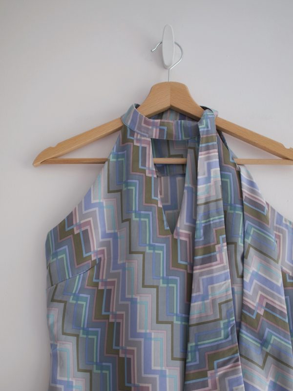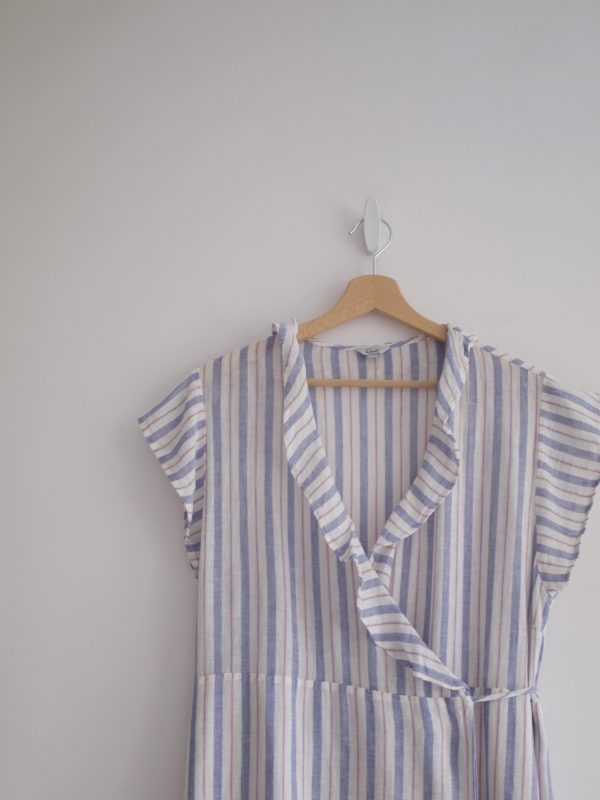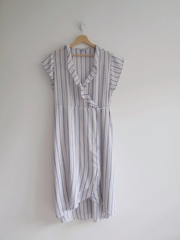 Kopertowa sukienka w paski. W części są dolnej dwie warstwy tkaniny.