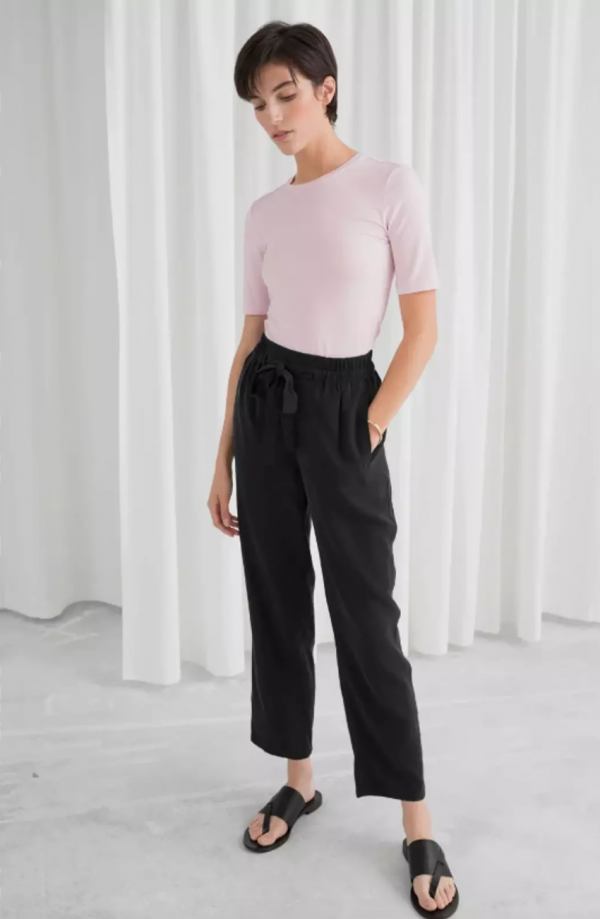 130,00 złSpodnie skandynawskiej marki Other Stories. Wykonane z miłej w dotyku mieszanki wiskozy oraz cupro. W pasie elastyczna gumka oraz troczki, z kieszeniami.