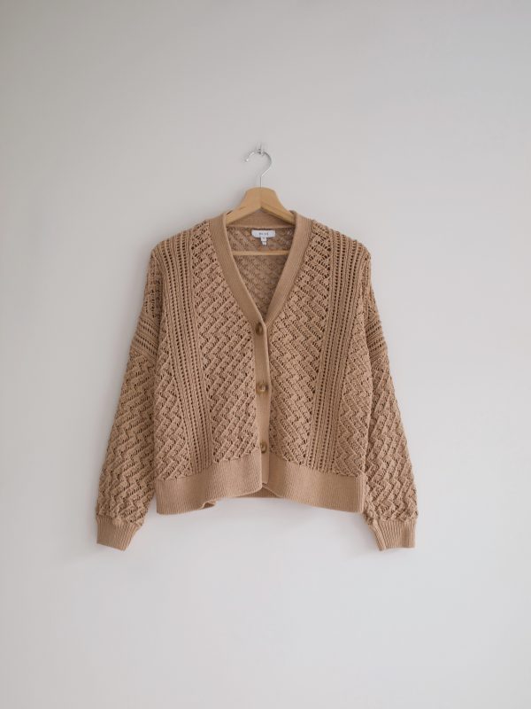 Ażurowy kardigan luksusowej marki Reiss. Wykonany z mieszanki lny, bawełny oraz wiskozy, dość gruby.